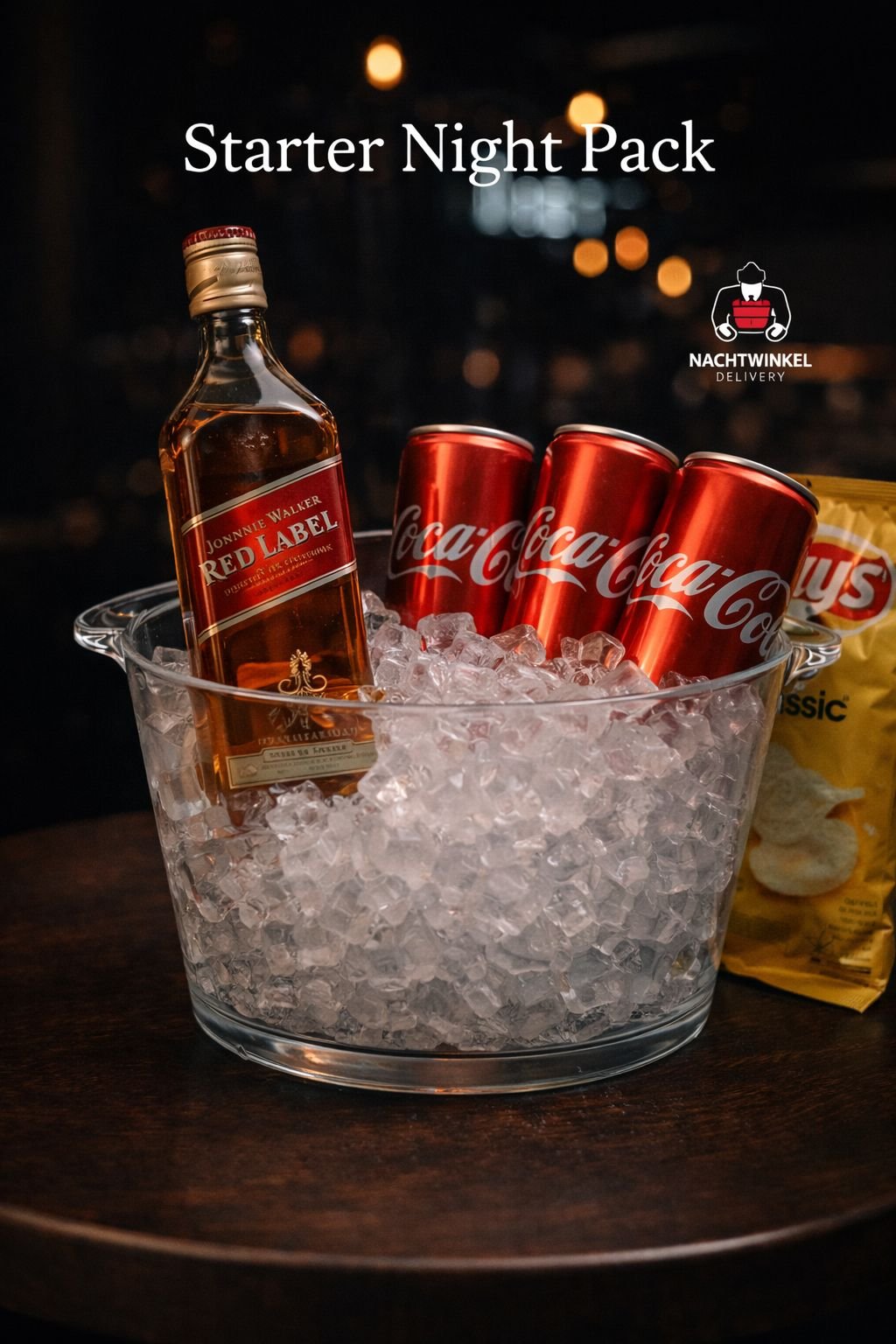 Geniet van Johnnie Walker Red Label, gecombineerd met Coca-Cola, ijsblokjes en chips.