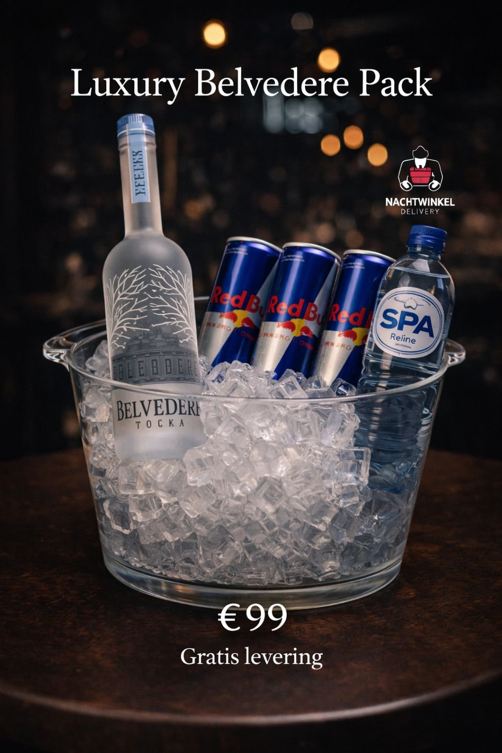 Geniet van Belvedere Vodka, gecombineerd met Red Bull, Spa Reine en ijsblokjes.